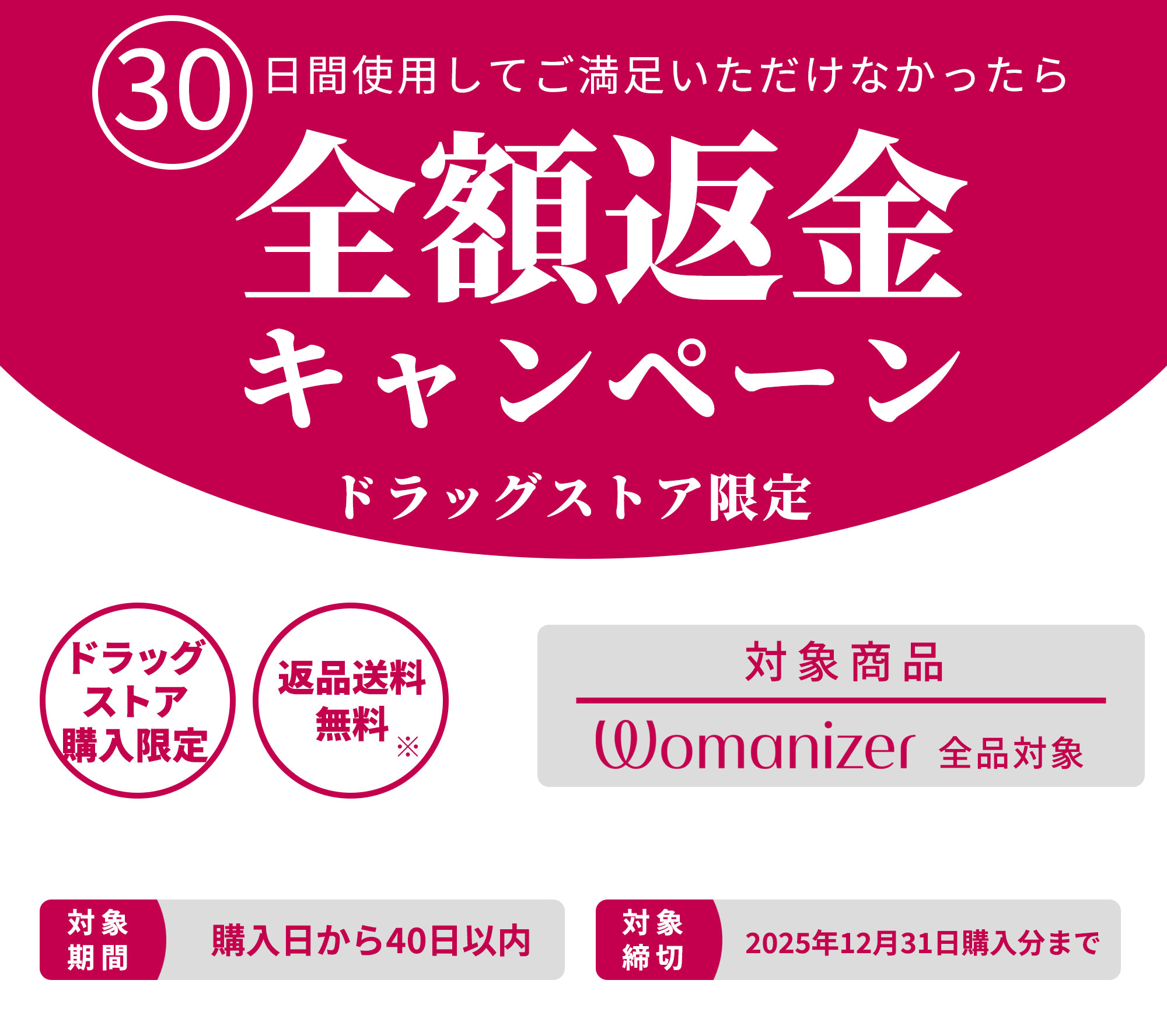 キャンペーン期間中にドラッグストアで購入いただいたウーマナイザー製品全品を対象に、満足いただけなかった場合、全額返金※をさせていただくキャンペーンです。